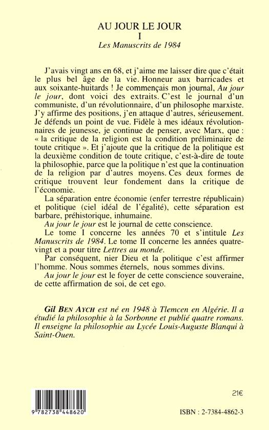 J'avais vingt ans en 68, et j'aime me laisser dire que c'était le plus bel âge de la vie. Honneur aux barricades et aux soixante-huitards ! Je commençais mon journal, Au jour le jour, dont voici les extraits. C'est le journal d'un communiste, d'un révolutionnaire, d'un philosophe marxiste. J'affirme mes positions, j'en attaque d'autres, sérieusement. Je continue de penser, avec Marx, que : ""La critique de la religion est la condition préliminaire de toute critique"". Et j'ajoute que la critique de la politique est la deuxième condition de toute critique, c'est-à-dire de toute philosophie, parce que la politique n'est que la continuation de la religion par d'autres moyens. Ces deux formes de critique trouvent leur fondement dans la critique de l'économie. Le tome I concerne les années 70 et s'intitule Les manuscrits de 1984. Le tome II concerne les années quatre-vingt et a pour titre Lettres au monde.