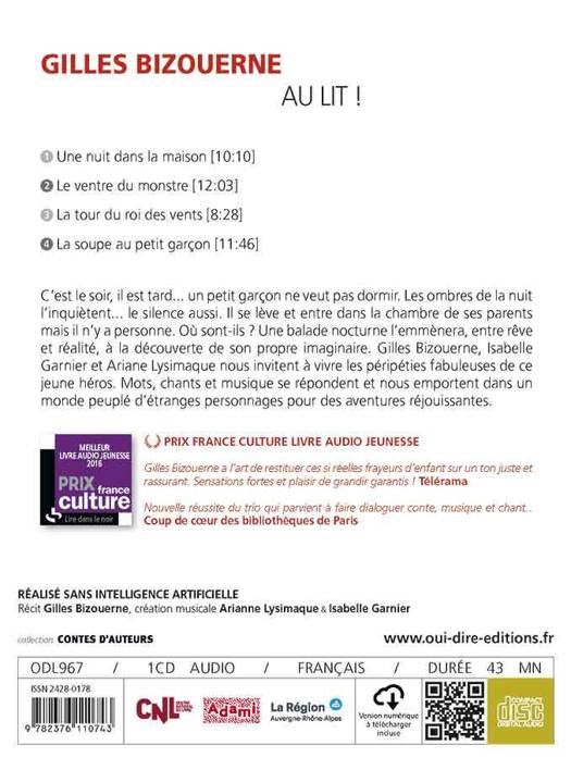 C'est le soir, il est tard... un petit garçon ne veut pas dormir. Les ombres de la nuit l'inquiètent... le silence aussi. Il se lève et entre dans la chambre de ses parents mais il n'y a personne. Où sont-ils ? Une balade nocturne l'emmènera, entre rêve et réalité, à la découverte de son propre imaginaire. Gilles Bizouerne, Ariane Lysimaque et Isabelle Garnier nous invitent à vivre les péripéties fabuleuses de ce jeune héros. Mots, chants et musique se répondent et nous emportent dans un monde peuplé d'étranges personnages pour des aventures réjouissantes. PRIX FRANCE CULTURE LIVRE AUDIO JEUNESSE Gilles Bizouerne a l'art de restituer ces si réelles frayeurs d'enfant sur un ton juste et rassurant. Sensations fortes et plaisir de grandir garantis ! Télérama Nouvelle réussite du trio qui parvient à faire dialoguer conte, musique et chant. . Coup de coeur des bibliothèques de Paris