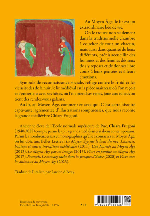 Au Moyen Age, le lit est un extraordinaire lieu de vie. On le trouve non seulement dans la traditionnelle chambre a coucher de tout un chacun, mais aussi dans quantite de lieux differents, pret a accueillir des hommes et des femmes desireux de s'y reposer et de donner libre cours a leurs pensees et a leurs emotions. Symbole de reconnaissance sociale, refuge contre le froid et les vicissitudes de la nuit, le lit medieval est la piece maitresse ou l'on recoit et s'entretient avec ses hotes, ou l'on prend ses repas, joue aux echecs ou tient des rendez-vous galants. Au lit, au Moyen Age, comment et avec qui. C'est cette histoire captivante, agrementee d'illustrations somptueuses, que nous raconte la grande medieviste Chiara Frugoni.
