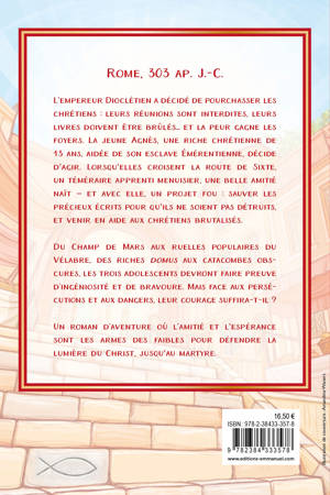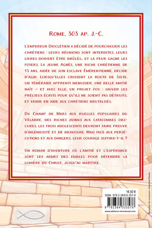 Rome, 303 ap. J.-C. L’empereur Dioclétien a décidé de pourchasser les chrétiens : leurs réunions sont interdites, leurs livres doivent être brûlés… et la peur gagne les foyers. La jeune Agnès, une riche chrétienne de 13 ans, aidée de son esclave Émérentienne, décide d'agir. Lorsqu'elles croisent la route de Sixte, un apprenti menuisier téméraire, une belle amitié naît — et avec elle, un projet fou : sauver les précieux écrits pour qu'ils ne soient pas détruits, et venir en aide aux chrétiens brutalisés. Du Champ de Mars aux ruelles populaires du Vélabre, des riches domus aux catacombes obscures, les trois adolescents devront faire preuve d’ingéniosité et de bravoure. Mais face aux persécutions et aux dangers, leur courage suffira-t-il ? Un roman d’aventure, où l’amitié et l'espérance sont les armes des faibles pour défendre la lumière du Christ, jusqu'au martyre.