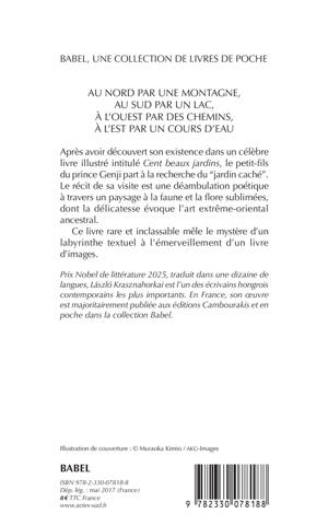 Après avoir découvert son existence dans un célèbre livre illustré intitulé "Cent beaux jardins", le petit-fils du prince Genji part à la recherche du "jardin caché". Le récit de sa visite est une déambulation poétique à travers un paysage à la faune et la flore sublimées, dont la délicatesse évoque l'art extrême-oriental ancestral. Ce livre rare et inclassable mêle le mystère d'un labyrinthe textuel à l'émerveillement d'un livre d'images.