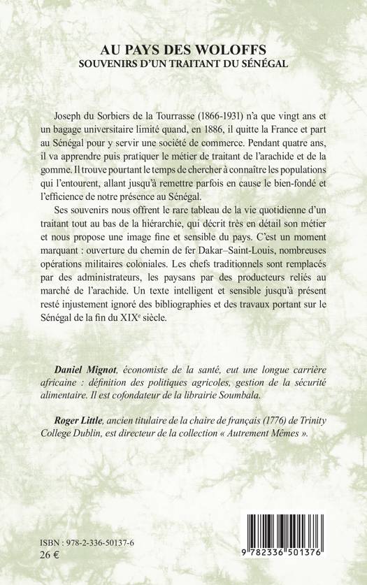 Joseph du Sorbiers de la Tourrasse (1866-1931) n'a que vingt ans et un bagage universitaire limité quand, en 1886, il quitte la France et part au Sénégal pour y servir une société de commerce. Pendant quatre ans, il va apprendre puis pratiquer le métier de traitant de l'arachide et de la gomme. Il trouve pourtant le temps de chercher à connaître les populations qui l'entourent, allant jusqu'à remettre parfois en cause le bien-fondé et l'efficience de notre présence au Sénégal. Ses souvenirs nous offrent le rare tableau de la vie quotidienne d'un traitant tout au bas de la hiérarchie, qui décrit très en détail son métier et nous propose une image fine et sensible du pays. C'est un moment marquant: ouverture du chemin de fer Dakar-Saint-Louis, nombreuses opérations militaires coloniales. Les chefs traditionnels sont remplacés par des administrateurs, les paysans par des producteurs reliés au marché de l'arachide. Un texte intelligent et sensible jusqu'à présent resté injustement ignoré des bibliographies et des travaux portant sur le Sénégal de la fin du XIXe siècle.