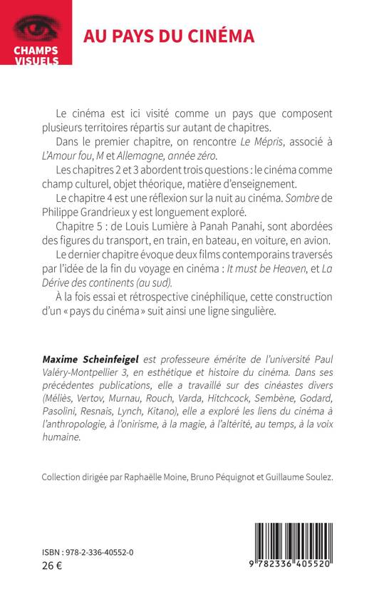 Le cinéma est ici visité comme un pays que composent plusieurs territoires répartis sur autant de chapitres. Dans le premier chapitre, on rencontre Le Mépris, associé à L'Amour fou, M et Allemagne, année zéro. Les chapitres 2 et 3 abordent trois questions : le cinéma comme champ culturel, objet théorique, matière d'enseignement. Le chapitre 4 est une réflexion sur la nuit au cinéma. Sombre de Philippe Grandrieux y est longuement exploré. Chapitre 5 : de Louis Lumière à Panah Panahi, sont abordées des figures du transport, en train, en bateau, en voiture, en avion. Le dernier chapitre évoque deux films contemporains traversés par l'idée de la fin du voyage en cinéma : It must be Heaven, et La Dérive des continents (au sud). À la fois essai et rétrospective cinéphilique, cette construction d'un « pays du cinéma » suit ainsi une ligne singulière.
