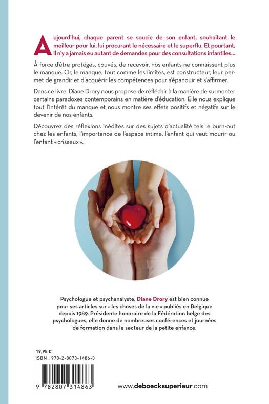Dans ce livre, Diane Drory nous propose de réfléchir à la manière de surmonter certains paradoxes contemporains en matière d’éducation. Elle nous explique tout l’intérêt du manque et nous montre ses effets positifs et négatifs sur le devenir de nos enfants.