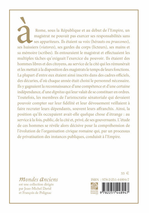 A Rome, sous la Republique et au debut de l'Empire, un magistrat ne pouvait pas exercer ses responsabilites sans ses appariteurs. Ils etaient sa voix (herauts ou praecones), ses huissiers (viatores), ses gardes du corps (licteurs), ses mains et sa memoire (scribes). Ils entouraient le magistrat et effectuaient les multiples taches qu'exigeait l'exercice du pouvoir. Ils etaient des hommes libres et des citoyens, au service de la cite qui les remunerait et les mettait a la disposition des magistrats le temps de leurs fonctions. La plupart d'entre eux etaient ainsi inscrits dans des cadres officiels, des decuries, d'ou chaque annee etait choisi le personnel necessaire. Ils y gagnaient la reconnaissance d'une competence et d'une certaine independance, d'une dignitas qui leur valait de se constituer en ordres. Toutefois, les membres de l'aristocratie senatoriale qui devaient pouvoir compter sur leur fidelite et leur devouement veillaient a faire recruter leurs dependants, souvent leurs affranchis. Ainsi, la position qu'ils occupaient avait-elle quelque chose d'etrange: au service a la fois, public, de la cite et, prive, de ses gouvernants. L'etude de ces hommes se revele alors decisive pour la comprehension de l'evolution de l'organisation civique romaine qui, par un processus de privatisation des instances publiques, conduisit a l'Empire.