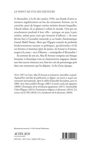 À Alexandrie, à la fin des années 1950, une bande d'amis se retrouve régulièrement au bar du restaurant Artinos, sur la corniche, pour de longues soirées animées durant lesquelles, l'alcool aidant, ils se plaisent à refaire le monde. Unis par un attachement profond à leur ville - presque un pays à part entière, même pour ceux qui viennent d'ailleurs -, ils sont divisés face à l'actualité nationale et au leader charismatique Gamal Abdel Nasser. Alors que l'Égypte connaît de profonds bouleversements sociaux et politiques, qu'adviendra-t-il de ces femmes et hommes épris de justice, de beauté et d'amour, acquis à la cause - ou à l'illusion - cosmopolite d'Alexandrie ? Au sommet de son art, Alaa El Aswany compose une fresque humaine et historique tout en chatoiements tragiques, faisant une fois encore résonner avec brio les voix de personnages pris dans une tourmente qui les dépasse : la fin d'une époque.
