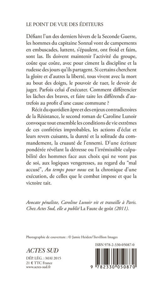Récit du quotidien âpre et des enjeux contradictoires de la Résistance, le second roman de Caroline Lunoir convoque tout ensemble les conditions de vie extrêmes de ces confréries improbables, les actions d'éclat et leurs revers cuisants, la dureté et la solitude du comman dement, la cruauté de l'ennemi. D'une écriture pondérée révélant la détresse ou l'irrémissible culpabilité des hommes face aux choix qui ne vont pas de soi, aux logiques vengeresses, au regard du "mal accusé", «Au temps pour nous» est la chronique d'une exécution, de celles que le combat impose et que la victoire tait.