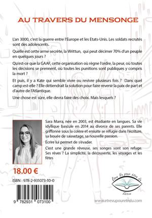 L’an 3000, c’est la guerre entre l’Europe et les Etats-Unis. Les soldats recrutés sont des adolescents. Quelle est cette arme secrète, la Writtun, qui peut décimer 70% d’un peuple en quelques jours ? Qu’est-ce que la GAAF, cette organisation où règne l’ordre, la peur, où toutes les décisions se prennent, où toutes les punitions sont publiques y compris la mort ? Et puis, il y a Kate qui semble vivre ou revivre plusieurs fois ? Dans quel camp est-elle ? Elle détiendrait la solution pour faire revenir la paix de part et d’autre de l’Atlantique. Peut-elle faire confiance à ses souvenirs, à Ethan, Victoria, Jean, Eden, James ? Une chose est sûre, elle devra faire des choix. Mais lesquels ?