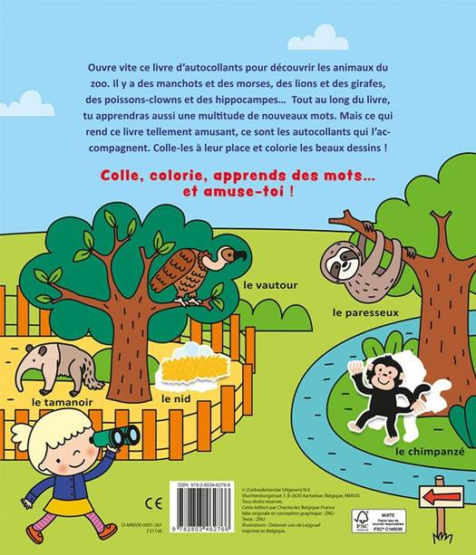 Ouvre vite ce livre d'autocollants pour découvrir les animaux du zoo. Il y a des manchots et des morses, des lions et des girafes, des poissons-clowns et des hippocampes… Tout au long du livre, tu apprendras aussi une multitude de nouveaux mots. Mais ce qui rend ce livre tellement amusant, ce sont les autocollants qui l'accompagnent. Colle-les à leur place et colorie les beaux dessins ! Des heures de plaisir pour les enfants de 3 à 5 ans Avec autocollants repositionnables