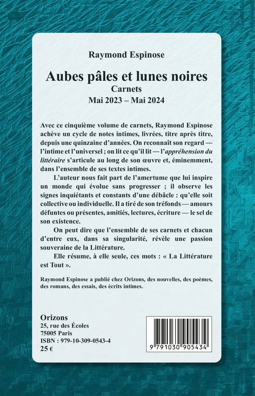 Avec ce cinquième volume de carnets, Raymond Espinose achève un cycle de notes intimes, livrées, titre après titre, depuis une quinzaine d'années. On reconnaît son regard ― l'intime et l'universel; on lit ce qu'il lit ― l'"appréhension du littéraire" s'articule au long de son oeuvre et, éminemment, dans l'ensemble de ses textes intimes. L'auteur nous fait part de l'amertume que lui inspire un monde qui évolue sans progresser; il observe les signes inquiétants et constants d'une débâcle: qu'elle soit collective ou individuelle. Il a tiré de son tréfonds - amours défuntes ou présentes, amitiés, lectures, écriture - le sel de son existence. On peut dire que l'ensemble de ses carnets et chacun d'entre eux, dans sa singularité, révèle une passion souveraine de la Littérature. Elle résume, à elle seule, ces mots: La Littérature est Tout .