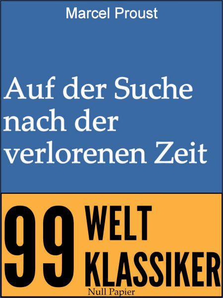 Der Roman Auf der Suche nach der verlorenen Zeit (frz. Originaltitel: À la recherche du temps perdu, geschrieben 1908/09 bis 1922 und erschienen zwischen 1913 und 1927) ist das Hauptwerk von Marcel Proust. Enthält den 1919 mit dem wichtigsten französischen Literaturpreis ausgezeichneten zweiten Band ›Im Schatten junger Mädchenblüte‹ (›À l'ombre des jeunes filles en fleurs‹) sowie den kompletten dritten Band in der Übersetzung von Walter Benjamin und Franz Hessel. Das Buch wurde in die ZEIT-Bibliothek der 100 Bücher aufgenommen. "Um verzweifelt zu sein, muß man am Leben, auch wenn es nur noch unglücklich sein kann, gleichwohl und trotz allem hängen." [Marcel Proust] Null Papier Verlag