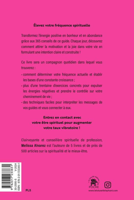 Ce livre sera un compagnon quotidien dans lequel vous trouverez : • comment déterminer votre fréquence actuelle et établir les bases d’une constante croissance ; • plus d’une trentaine d’exercices concrets pour expulser les énergies négatives et prendre le contrôle sur votre cheminement de vie ; • des techniques faciles pour interpréter les messages de vos guides et vous connecter à eux.