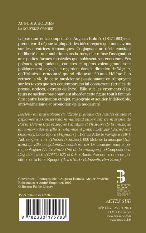 Le parcours de la compositrice Augusta Holmès (1847-1903) surprend, car il déjoue la plupart des idées reçues que nous avons sur les créatrices romantiques. Conjuguant un désir constant de liberté et une ambition sans bornes, elle refuse l'assignation aux petites formes musicales que subissent ses consoeurs. Ses poèmes symphoniques, cantates et opéras voient grand, sont politiquement engagés et regardent dans la direction de Wagner, qu'Holmès a rencontré quand elle avait 20 ans. Hélène Cao retrace la vie de cette musicienne passionnante en s'appuyant sur les textes que ses contemporains lui consacrent (articles de presse, notices, extraits de livre). Elle suit les errements d'auteurs ne sachant pas comment aborder cette figure tout à fait inédite : entre fascination et rejet, misogynie et soutien indéfectible, anti-wagnérisme et promotion de la modernité.