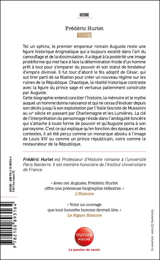 Cette biographie entend concilier l’histoire, la mémoire  et le mythe auquel un homme donna naissance et qui ne  cessa d’évoluer depuis son décès jusqu’à son exploitation  par l’Italie fasciste de Mussolini au XXe siècle en passant  par Charlemagne et les Lumières. La clé de l’interprétation  du personnage réside dans l’ambiguïté foncière qui  s’attache à toute forme de pouvoir et qu’Auguste porta  à son paroxysme. C’est ce qui explique qu’en fonction  des époques et des contextes, il ait été perçu comme  un monarque absolu à l’image de Louis XIV ou comme  un prince républicain, voire comme le restaurateur de la  République.