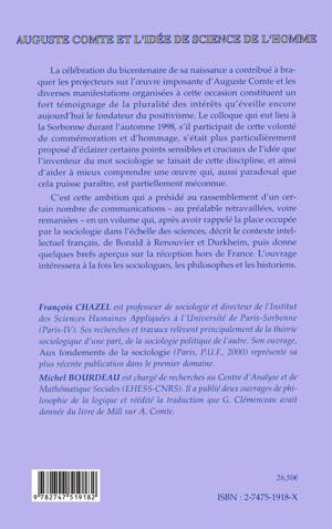 Le colloque organisé à l'occasion du bicentenaire de la naissance d'Auguste Comte, s'est particulièrement proposé d'éclairer certains points sensibles et cruciaux de l'idée que l'inventeur du mot sociologie se faisait de cette discipline, aidant ainsi à mieux comprendre une œuvre qui est partiellement méconnue. Intéressant à la fois les sociologues, les philosophes et les historiens, l'ouvrage rappelle la place de la sociologie dans l'échelle des sciences, décrit le contexte intellectuel français, de Bonald à Renouvier et Durkheim, puis donne quelques aperçus sur la réception hors de France.