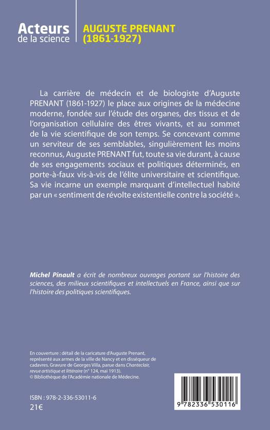 La carrière de médecin et de biologiste d'Auguste PRENANT (1861-1927) le place aux origines de la médecine moderne, fondée sur l'étude des organes, des tissus et de l'organisation cellulaire des êtres vivants, et au sommet de la vie scientifique de son temps. Se concevant comme un serviteur de ses semblables, singulièrement les moins reconnus, Auguste PRENANT fut, toute sa vie durant, à cause de ses engagements sociaux et politiques déterminés, en porte-à-faux vis-à-vis de l'élite universitaire et scientifique. Sa vie incarne un exemple marquant d'intellectuel habité par un sentiment de révolte existentielle contre la société .