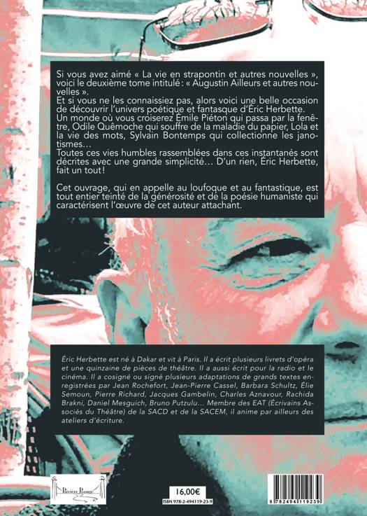 À n’en pas douter, si nous étions dans les années 50, Éric Herbette, à l’instar de Boris Vian, rejoindrait sans tarder le collège de Pataphysique. Créé en 1948, cette société de recherches savantes et inutiles promeut la pataphysique, et ses solutions imaginaires, en prenant tout au sérieux, sauf le sérieux. Mais, Éric Herbette n’est pas qu’un écrivain de l’absurde et du fantasque. Animé par une grande poésie humaniste il a simplement l’art de tourner en légèreté les choses pesantes de la vie. Ce recueil de nouvelles est aussi merveilleusement représentatif de l’imaginaire débordant de l’auteur, qui nous dévoile des personnages à la Jacques Tati, fantasques, truculents, inquiétants parfois, tels que : Émile Piéton qui passa par la fenêtre, Odile Quêmoche qui souffre de la maladie du papier, Lola et la vie des mots, Sylvain Bontemps qui collectionne les janotismes... Toutes ces vies humbles, rassemblées dans ces instantanés, sont décrites avec une grande simplicité car d’un rien, Éric Herbette fait un tout. Ce recueil préfacé par Oscar Sisto (comédien et metteur en scène) dévoile une œuvre gracieuse, inventive, poétique, ténébreuse et lumineuse à la fois, dont la grande humanité ne pourra que durablement vous marquer.