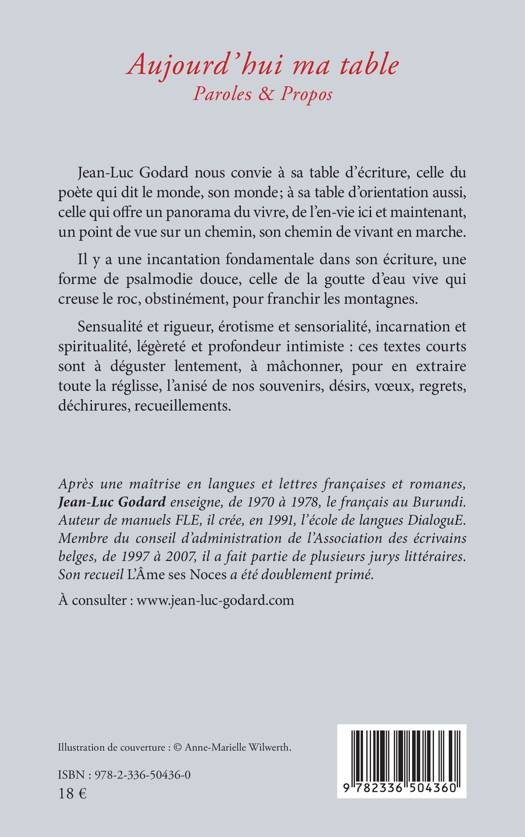 Jean-Luc Godard nous convie à sa table d’écriture, celle du poète qui dit le monde, son monde ; à sa table d’orientation aussi, celle qui offre un panorama du vivre, de l’en-vie ici et maintenant, un point de vue sur un chemin, son chemin de vivant en marche. Il y a une incantation fondamentale dans son écriture, une forme de psalmodie douce, celle de la goutte d’eau vive qui creuse le roc, obstinément, pour franchir les montagnes. Sensualité et rigueur, érotisme et sensorialité, incarnation et spiritualité, légèreté et profondeur intimiste : ces textes courts sont à déguster lentement, à mâchonner, pour en extraire toute la réglisse, l’anisé de nos souvenirs, désirs, vœux, regrets, déchirures, recueillements.