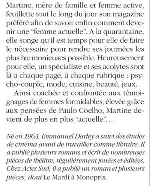 «Né en 1963, Emmanuel Darley a suivi des études de cinéma avant de travailler comme libraire. Il a publié plusieurs romans et écrit de nombreuses pièces de théâtre, réguliérement jouées et éditées. Chez Actes Sud, il a publié un roman et plusieurs pièces, dont» Le Mardi et Monopoly.