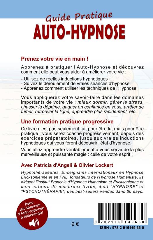 Prenez votre vie en main ! Apprenez à pratiquer l'Auto-Hypnose et découvrez comment elle peut vous aider à améliorer votre vie. Utilisez de réelles inductions hypnotiques. Suivez le déroulement de vraies séances d'hypnose. Apprenez comment utiliser les techniques de l'Hypnose. Vous appliquerez votre savoir-faire dans les domaines importants de votre vie : mieux dormir, gérer le stress, chasser la déprime, gagner en confiance en vous, arrêter de fumer, retrouver la ligne, apprendre plus rapidement, etc. Une formation pratique progressive. Ce livre n'est pas seulement fait pour être lu, mais pour être pratiqué : vous serez coaché progressivement, depuis des exercices préparatoires, jusqu'aux vraies inductions hypnotiques qui vous feront découvrir l'état d'hypnose. Vous allez apprendre véritablement à vous servir de la plus merveilleuse et puissante magie. Celle de votre esprit !
