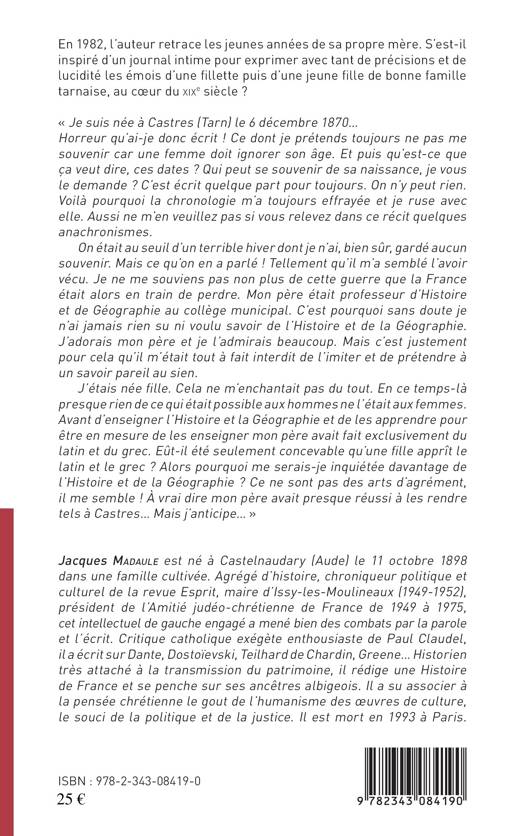 En 1982, l'auteur retrace les jeunes années de sa propre mère. S'est-il inspiré d'un journal intime pour exprimer avec tant de précisions et de lucidité les émois d'une fillette puis d'une jeune fille de bonne famille tarnaise, au coeur du XIXe siècle ?