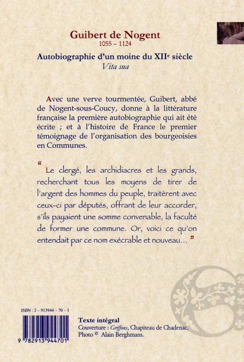 Avec une verve tourmentée, Guibert, abbé de Nogent-sous-Coucy, donne à la littérature française la première autobiographie qui ait été écrite ; et à l'histoire de France le premier témoignage de l'organisation des bourgeoisies en Communes.