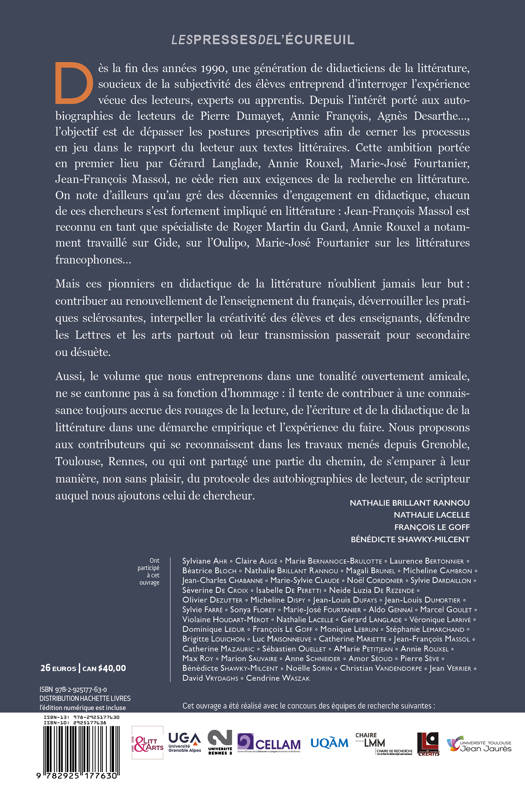 Dès la fin des années 1990, une génération de didacticiens de la littérature, soucieux de la subjectivité des élèves entreprend d'interroger l'expérience vécue des lecteurs, experts ou apprentis. Depuis l'intérêt porté aux auto-biographies de lecteurs de Pierre Dumayet, Annie François, Agnès Desarthe..., l'objectif est de dépasser les postures prescriptives afin de cerner les processus en jeu dans le rapport du lecteur aux textes littéraires. Cette ambition portée en premier lieu par Gérard Langlade, Annie Rouxel, Marie-José Fourtanier, Jean-François Massol, ne cède rien aux exigences de la recherche en littérature. On note d'ailleurs qu'au gré des décennies d'engagement en didactique, chacun de ces chercheurs s'est fortement impliqué en littérature : Jean-François Massol est reconnu en tant que spécialiste de Roger Martin du Gard, Annie Rouxel a notam-ment travaillé sur Gide, sur l'Oulipo, Marie-José Fourtanier sur les littératures francophones... Mais ces pionniers en didactique de la littérature n'oublient jamais leur but : contribuer au renouvellement de l'enseignement du français, déverrouiller les prati-ques sclérosantes, interpeller la créativité des élèves et des enseignants, défendre les Lettres et les arts partout où leur transmission passerait pour secondaire ou désuète. Aussi, le volume que nous entreprenons dans une tonalité ouvertement amicale, ne se cantonne pas à sa fonction d'hommage : il tente de contribuer à une connais-sance toujours accrue des rouages de la lecture, de l'écriture et de la didactique de la littérature dans une démarche empirique et l'expérience du faire. Nous proposons aux contributeurs qui se reconnaissent dans les travaux menés depuis Grenoble, Toulouse, Rennes, ou qui ont partagé une partie du chemin, de s'emparer à leur manière, non sans plaisir, du protocole des autobiographies de lecteur, de scripteur auquel nous ajoutons celui de chercheur.