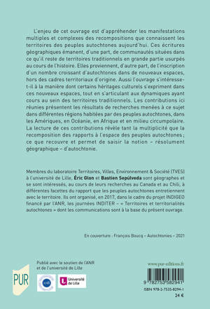 L’enjeu de cet ouvrage est d’appréhender les manifestations multiples et complexes des recompositions que connaissent les territoires des peuples autochtones aujourd’hui. Ces écritures géographiques émanent, d’une part, de communautés situées dans ce qu’il reste de territoires traditionnels en grande partie usurpés au cours de l’histoire. Elles proviennent, d’autre part, de l’inscription d’un nombre croissant d’autochtones dans de nouveaux espaces, hors des cadres territoriaux d’origine.