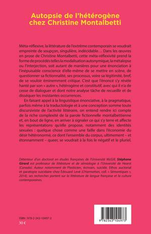 En faisant appel à la linguistique énonciative, à la pragmatique, parfois même à la traductologie et à une conception somme toute discursiviste de l'activité littéraire, on entend rendre ici compte de la riche complexité de la parole fictionnelle montalbettienne et, en bout de ligne, en arriver à signaler ce qui s'y terre et affecte les représentations qu'elle propose, notamment des identités sexuées : quelque chose comme une faille dans l'économie du désir hétéronormé, ce dont l'ensemble du corpus, ultimement et étonnamment queer, se voudrait à la fois le négatif et le pluriel.