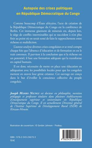 Comme beaucoup d’États africains, l’acte de création de la République Démocratique du Congo est la conférence de Berlin. Cet immense gisement de minerais est, depuis lors, le siège de conflits interminables qui se succèdent à n’en plus finir au point où on serait tenté de faire le rapprochement entre richesse et malédiction. L’auteur analyse diverses crises congolaises et se rend compte chaque fois que l’absence d’éducation et de formation en est le trait commun. Il parvient à la conclusion que si la richesse est un potentiel, il faut une formation adéquate qui la transforme en capital humain. Il est donc nécessaire de mette en place une éducation en adéquation avec les possibilités locales pour que les congolais mettent en oeuvre leur génie créateur.