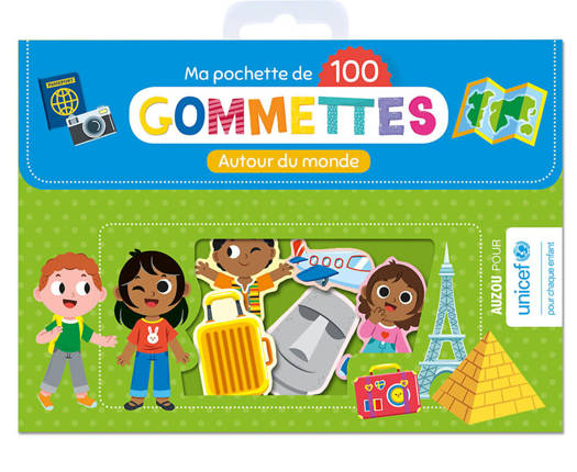 100 gommettes repositionnables sur le thème du monde ! Grâce à la languette, elles se décollent facilement pour les petites mains.