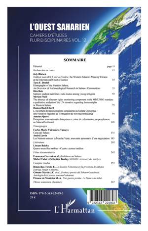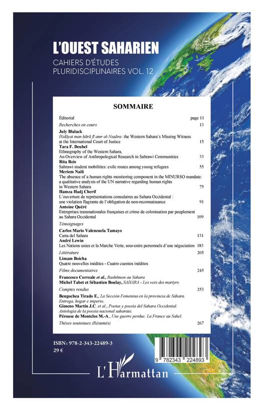 Ce cahier paraît dans un contexte de reprise de la guerre au Sahara Occidental, qui suscite de grandes incertitudes sur la situation politique et militaire des prochains mois dans la région. Il donne une idée de la vitalité des recherches contemporaines sur le Sahara Occidental, avec des travaux de jeunes chercheurs qui s'emparent avec brio et renouvellent des questions historiques, politiques ou encore juridiques. Il offre également deux témoignages très personnels de diplomates ayant occupé des fonctions onusiennes à des moments-clés de l'histoire de ce territoire, matériaux historiques bruts qui éclairent et nourrissent à leur manière l'histoire du conflit. Enfin, ce volume 12 met à l'honneur un auteur important du groupe des poètes « cubaraouis » de la Generación de la Amistad, Limam Boicha, dont nous proposons quatre nouvelles inédites. Un numéro très varié qui permet de prendre un recul nécessaire sur l'actualité brûlante de ce territoire.