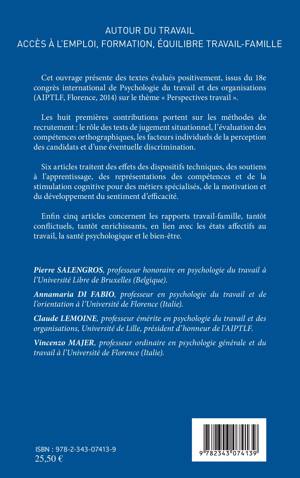 Cet ouvrage présente des textes issus du 18e congrès international de Psychologie du travail et des organisations sur le thème « Perspectives travail ». Les huit premières contributions portent sur les méthodes de recrutement. Six articles traitent des effets des dispositifs techniques, des soutiens à l'apprentissage, des représentations des compétences et de la stimulation cognitive. Enfin cinq articles concernent les rapports travail-famille, tantôt conflictuels, tantôt enrichissants.