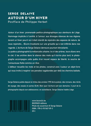 Autour d'un hiver, promenade poético-photographique aux alentours de Liège. Hommage implicite à l'amitié, à l'amour, aux étranges silences de nos régions durant un hiver pourri où il était interdit de rejoindre des espaces de nature, de nous rejoindre... Œuvre troublante sur une grisaille qui s'est infiltrée dans nos regards. L'écriture de Serge Delaive demeure pourtant étincelante. <br /> Le poète a photographié la mélancolie urbaine, le cri des arbres, leurs élans vers le ciel, il les archive dans le silence des mots qu'il écrira plus tard, le photographe accompagne cette quête d'un nouvel espace de liberté, le sourire de l'amoureuse flotte comme un rêve. <br /> L'éditeur recueille les mots et les photos, construit avec l'auteur un objet-livre qui vous invite à respirer ces pensées vagabondes par-delà les chemins balisés.