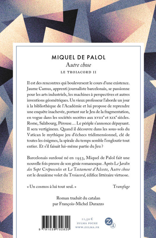 Il est des rencontres qui bouleversent le cours d’une existence. Jaume Camus, apprenti journaliste barcelonais, se passionne pour les arts industriels, les machines à perspectives et autres inventions géométriques. Un vieux professeur l’aborde un jour à la bibliothèque de l’Académie et lui propose de reprendre une enquête inachevée, portant sur le Jeu de la fragmentation, en vogue dans les sociétés secrètes aux XVIIIe et XIXe siècles. Rome, Salzbourg, Pérouse… Le périple s’annonce dépaysant. Il sera vertigineux. Quand il découvre dans les sous-sols du Vatican le mythique jeu d'échecs tridimensionnel, clé de toutes les énigmes, la spirale du temps semble l’engloutir tout entier. Et s’il faisait lui-même partie du Jeu ?
