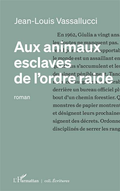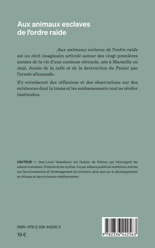 Aux animaux esclaves de l’ordre raide est un récit imaginaire articulé autour des vingt premières années de la vie d’une conteuse cévenole, née à Marseille en 1942. Année de la rafle et de la destruction du Panier par l’armée allemande. S’y entrelacent des réflexions et des observations sur des existences dont la trame et les soubassements vont se révéler inattendus.
