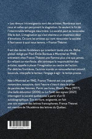 « Les rêveurs intransigeants sont des artistes. Nombreux sont ceux et celles qui perçoivent la stagnation. Ils veulent la fin de l’interminable léthargie meurtrière. La société peut se renouveler. Elle le doit. L’imagination qui s’est éteinte a un impérieux désir d’émotions. Ce sont les artistes qui vont renouveler la société. Il faut savoir à quoi nous tenons. » France Théoret Il est des textes fondateurs qui orientent toute une vie. Refus global, rédigé par Paul-Émile Borduas à Montréal en 1948, entretient chez France Théoret une flamme plus vive que jamais. En relisant ce manifeste, qui « comprend une matière explosive, un grand texte de liberté », elle convoque la responsabilité des artistes, appelle à placer l’imagination au centre de l’action. Par-delà les frontières, l’autrice scande un renouvellement émotif, bouscule, interpelle le lecteur, l’engage à agir : le temps presse. Née à Montréal en 1942, France Théoret est une poétesse, romancière, essayiste, dont l’oeuvre s’inscrit dans la prise de paroles des femmes. Parmi ses livres, Bloody Mary (1977), Une belle éducation (2006) ou La Forêt des signes (2021) interrogent la société québécoise à partir d’un fil autobiographique. Son écriture, exigeante, en fait une voix majeure des lettres francophones. France Théoret est membre de l’Académie des lettres du Québec. En 2012, elle a reçu le prestigieux prix Athanase-David pour l’ensemble de son oeuvre.