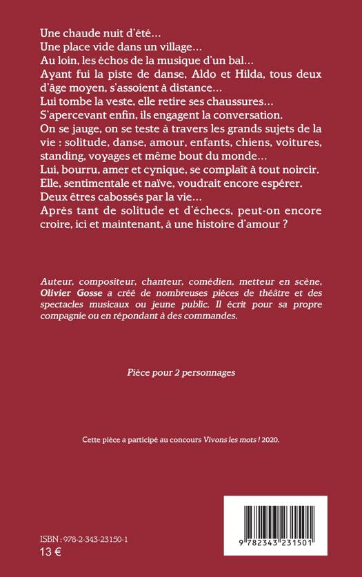Une chaude nuit d'été... Une place vide dans un village... Au loin, les échos de la musique d'un bal...Ayant fui la piste de danse, Aldo et Hilda, tous deux d'âge moyen, s'assoient à distance... Lui tombe la veste, elle retire ses chaussures...S'apercevant enfin, ils engagent la conversation. On se jauge, on se teste à travers les grands sujets de la vie: solitude, danse, amour, enfants, chiens, voitures, standing, voyages et même bout du monde... Lui, bourru, amer et cynique, se complaît à tout noircir. Elle, sentimentale et naïve, voudrait encore espérer. Deux êtres cabossés par la vie...Après tant de solitude et d'échecs, peut-on encore croire, ici et maintenant, à une histoire d'amour ?