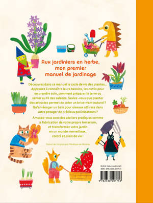 Découvre dans ce manuel le cycle de vie des plantes... Apprends à connaître leurs besoins, les outils pour en prendre soin, comment préparer la terre ou semer au fil des saisons. Savais-tu que planter des arbustes permet de créer un brise-vent naturel ? Qu'aménager un bain pour oiseaux attirera dans ton potager de précieux pollinisateurs ? Amuse-toi avec des ateliers pratiques comme la fabrication de ton propre terrarium, et transforme ton jardin en un monde merveilleux, coloré et plein de vie !