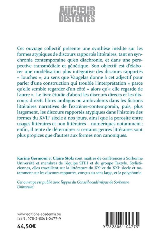 Cet ouvrage collectif présente une synthèse inédite sur les formes atypiques de discours rapportés littéraires, tant en synchronie contemporaine qu'en diachronie, et dans une perspective transmédiale et générique. Son objectif est d'élaborer une modélisation plus intégrative des discours rapportés « louches », au sens que Vaugelas donne à cet adjectif pour parler d'une construction qui trouble l'interprétation « parce qu'elle semble regarder d'un côté » alors qu'« elle regarde de l'autre ».