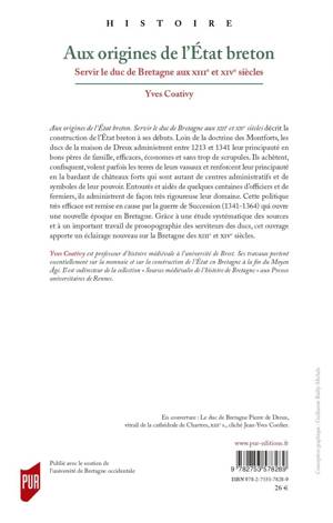Aux origines de l'Etat breton. Servir le duc de Bretagne aux XIIIe et XIVe siècles décrit la construction de l'Etat breton à ses débuts. Loin de la doctrine des Montforts, les ducs de la maison de Dreux administrent entre 1213 et 1341 leur principauté en bons pères de famille, efficaces, économes et sans trop de scrupules. Ils achètent, confisquent, volent parfois les terres de leurs vassaux et renforcent leur principauté en la bardant de châteaux forts qui sont autant de centres administratifs et de symboles de leur pouvoir. Entourés et aidés de quelques centaines d'officiers et de fermiers, ils administrent de façon très rigoureuse leur domaine. Cette politique très efficace est remise en cause par la guerre de Succession (1341-1364) qui ouvre une nouvelle époque en Bretagne. Grâce à une étude systématique des sources et à un important travail de prosopographie des serviteurs des ducs, cet ouvrage apporte un éclairage nouveau sur la Bretagne des XIIIe et XIVe siècles.