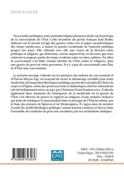 Nos sociétés politiques sont construites depuis plusieurs siècles sur le principe de la souveraineté de l'État. Cette invention du juriste français Jean Bodin, élaborée sur le terrain ravagé des guerres entre rois et papes caractéristiques des temps médiévaux, a nourri la pensée occidentale de l'autorité politique jusqu'à nos jours. Elle véhicule avec elle une vision de la division entre politique et religieux qui détermine, encore aujourd'hui, la division que nous estimons la majeure partie du temps évidente entre ces deux sphères...