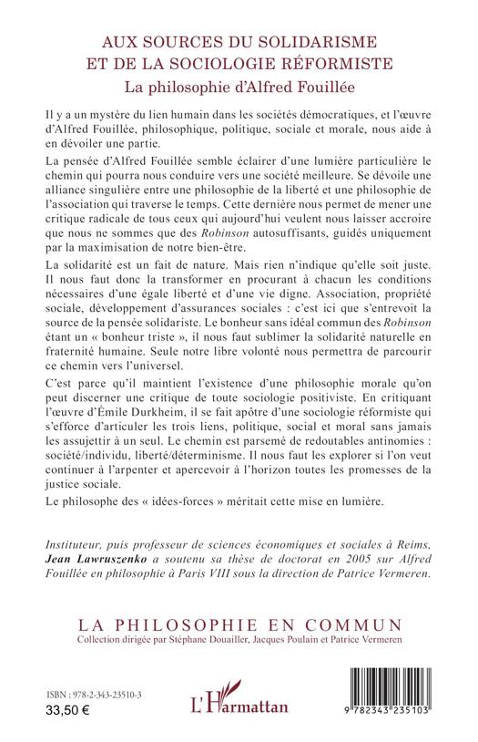 Il y a un mystère du lien humain dans les sociétés démocratiques, et l'oeuvre d'Alfred Fouillée nous aide à en dévoiler une partie. Sa pensée semble éclairer le chemin qui pourra nous conduire vers une société meilleure. Se dévoile une alliance singulière entre une philosophie de la liberté et une philosophie de l'association. Cette dernière nous permet de mener une critique radicale de tous ceux qui voudraient que nous ne soyons que des Robinson autosuffisants, maximisant notre bien-être. La solidarité est un fait de nature. Mais rien n'indique qu'elle soit juste. Il nous faut donc la transformer en procurant à chacun les conditions nécessaires d'une égale liberté et d'une vie digne. Association, propriété sociale, développement d'assurances sociales: c'est ici que s'entrevoit la source de la pensée solidariste. Il nous faut sublimer la solidarité naturelle en fraternité humaine. Seule notre libre volonté nous permettra de viser l'universel. En critiquant l'oeuvre de Durkheim, Fouillée se fait apôtre d'une sociologie réformiste. Le chemin vers la justice sociale est parsemé de redoutables antinomies qu'il faudra explorer.