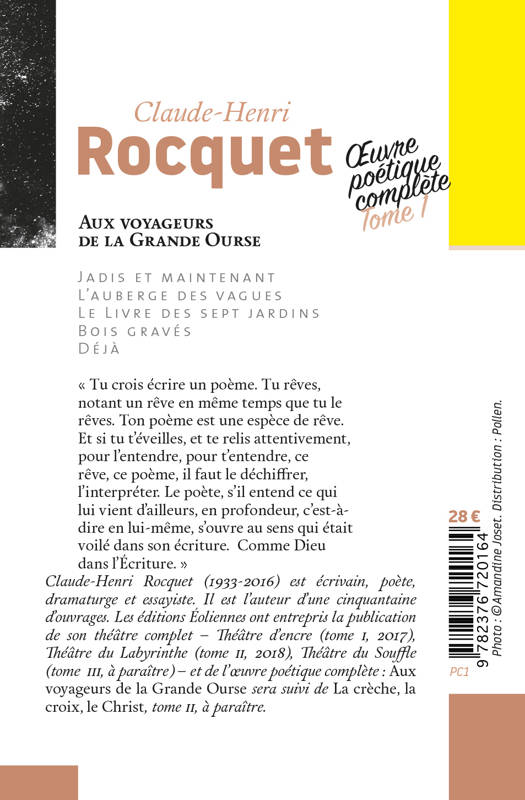 « Tu crois écrire un poème. Tu rêves, notant un rêve en même temps que tu le rêves. Ton poème est une espèce de rêve. Et si tu t'éveilles, et te relis attentivement, pour l'entendre, pour t'entendre, ce rêve, ce poème, il faut le déchiffrer, l'interpréter. Le poète, s'il entend ce qui lui vient d'ailleurs, en profondeur, c'est-à-dire en lui-même, s'ouvre au sens qui était voilé dans son écriture. Comme Dieu dans l'Écriture. » Claude-Henri Rocquet (1933-2016) est écrivain, poète, dramaturge et essayiste. Il est l'auteur d'une cinquantaine d'ouvrages. Les éditions Éoliennes ont entrepris la publication de son théâtre complet - Théâtre d'encre (tome I, 2017), Théâtre du Labyrinthe (tome II, 2018), Théâtre du Souffle (tome III, à paraître) - et de l'oeuvre poétique complète : Aux voyageurs de la Grande Ourse sera suivi de La crèche, la croix, le Christ, tome II, à paraître.