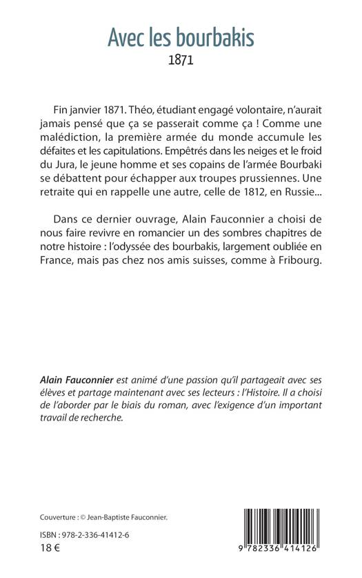 Fin janvier 1871. Théo, étudiant engagé volontaire, n'aurait jamais pensé que ça se passerait comme ça ! Comme une malédiction, la première armée du monde accumule les défaites et les capitulations. Empêtrés dans les neiges et le froid du Jura, le jeune homme et ses copains de l'armée Bourbaki se débattent pour échapper aux troupes prussiennes. Une retraite qui en rappelle une autre, celle de 1812, en Russie... Dans ce dernier ouvrage, Alain Fauconnier a choisi de nous faire revivre en romancier un des sombres chapitres de notre histoire: l'odyssée des bourbakis, largement oubliée en France, mais pas chez nos amis suisses, comme à Fribourg.
