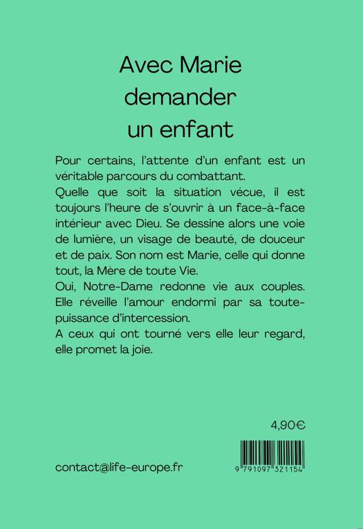 Pour certains, l’attente d’un enfant est un véritable parcours du combattant. Quelle que soit la situation vécue, il est toujours l’heure de s’ouvrir à un face-à-face intérieur avec Dieu. Se dessine alors une voie de lumière, un visage de beauté, de douceur et de paix. Son nom est Marie, celle qui donne tout, la Mère de toute Vie. Oui, Notre-Dame redonne vit aux couples. Elle réveille l’amour endormi par sa toute-puissance d’intercession. A ceux qui ont tourné vers elle leur regard, elle promet la joie.
