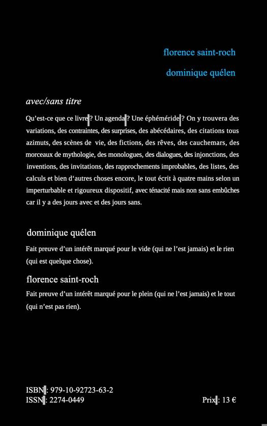 Ce livre s'est écrit, lundi après lundi, une année durant. Les semaines paires sont des propositions de Florence Saint-Roch, dont les textes sont en romain, les semaines impaires de Dominique Quélen, dont les textes sont en italique. Les textes avec correspondent aux heures de jour, les textes sans aux heures de nuit. Le nombre de signes s’entend espaces comprises.