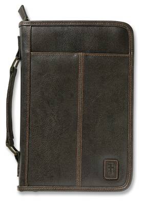 This sturdy Bible cover features a classic design in a popular weathered look and fits most standard size books and Bibles up to 6-5/8" x 9-1/2". Contrasting tan stitching on a durable brown imitation leather material gives this Bible case a handsome style, with a subtle cross design patch in the corner. The interior and exterior pockets and handy carrying handle make this a great way to travel with your Bible, while protecting your notes and other materials as well.