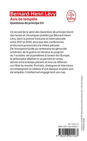 Ce recueil de la série des Questions de principe réunit des textes et chroniques publiés par Bernard-Henri Lévy, dans la presse française et internationale, entre 2017 et 2024. Ainsi que des conférences et discours prononcés à la même période. De l’exception kurde au centenaire du génocide arménien, de la guerre en Ukraine au pogrom du 7 octobre, de la pandémie à l’avenir de l’Europe, le philosophe déploie ici sa pensée en actes, donne à lire le temps présent et livre sa réflexion sur l’état du monde. Portraits, dialogues et interviews accompagnent ce tableau d’une époque en plein avis de tempête. L’intellectuel engagé tient son cap.
