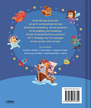 Geniet elke dag van de week van een 5-minutenverhaal met deze fantastische verzameling. Van een piratenreis tot de ontdekking van Dromenland, dit boek zit boordevol actie en avonturen! Met 7 verhaaltjes voor het slapengaan om keer op keer samen te lezen.